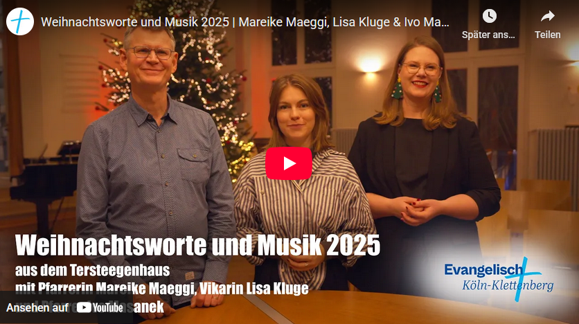 Passend zur Weihnachtszeit gibt’s von unserer Heimatgemeinde, genauer von und mit Mareike Maeggi, Lisa Kluge und Ivo Masanek, ein neues Video auf YouTube. In ihrer diesjährigen Ausgabe von „Weihnachtsworte und Musik“ aus dem Tersteegenhaus verweben die drei „Sterne“, „die Krippe“ und „Leb-Kuchen“ zu weihnachtlicher Stimmung und dem Weihnachtssegen.
